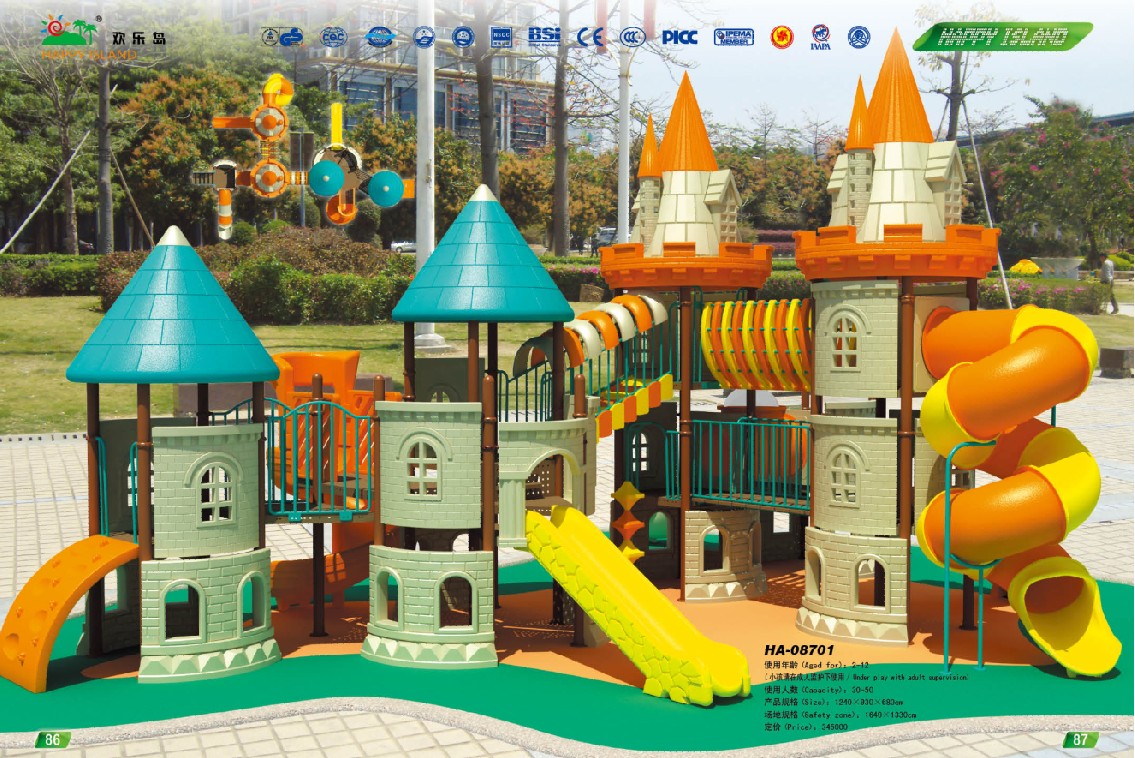 产品描述:产品通过ISO9001国际质量体系认证,并由太平保险有限公司承保。材料:进口材料. 特点:根据小朋友的兴趣及爱好精心设计各种不同样式,款式新颖,色彩鲜艳,不褪色,经久耐用,结实牢固,质量可靠. 适用范围:学校、幼儿园、花园、别墅、公园、物业小区、游乐场、少年宫、商场、超市等各类室内外场所供小朋友游玩娱乐。